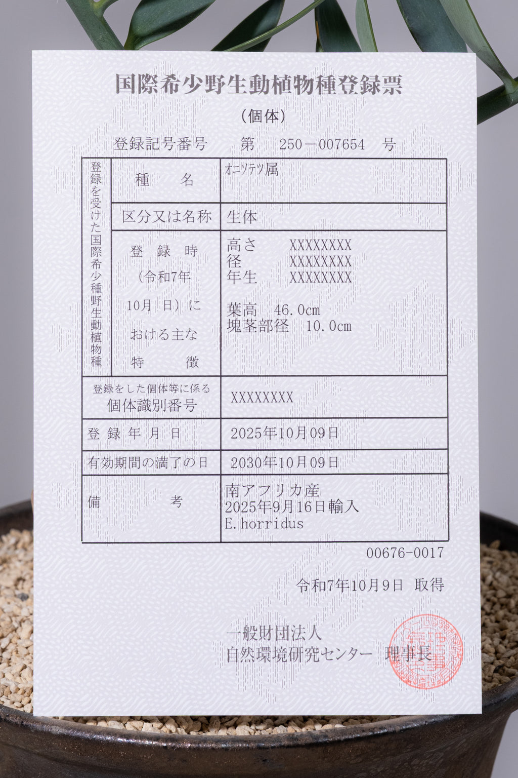 【商品到着後、移転登録について】譲受後、30日以内に自然環境研究センターに届け出が必要になります。Webまたは書面で必ずお手続をお願い致します。【注意事項 ※必ずご確認くださいませ。】・写真をよくご確認の上ご購入ください。・ダメージ・汚れ・キズ、状態については写真をご参照くださいませ。・運送中の衝撃や揺れにより、葉や花芽、子株などが落ちてしまうことがありますが予めご了承ください。・商品到着後はなるべく早く開梱いただき、商品の状態をご確認いただくようお願いいたします。・商品が破損して届いた場合は、到着日か翌日までに必ずご連絡ください。・梱包は衝撃等に極力耐えられるように頑丈に梱包しておりますので、荷ほどきの際もご注意ください。・お客様ご都合での返品交換等は承れませんので予めご了承ください。