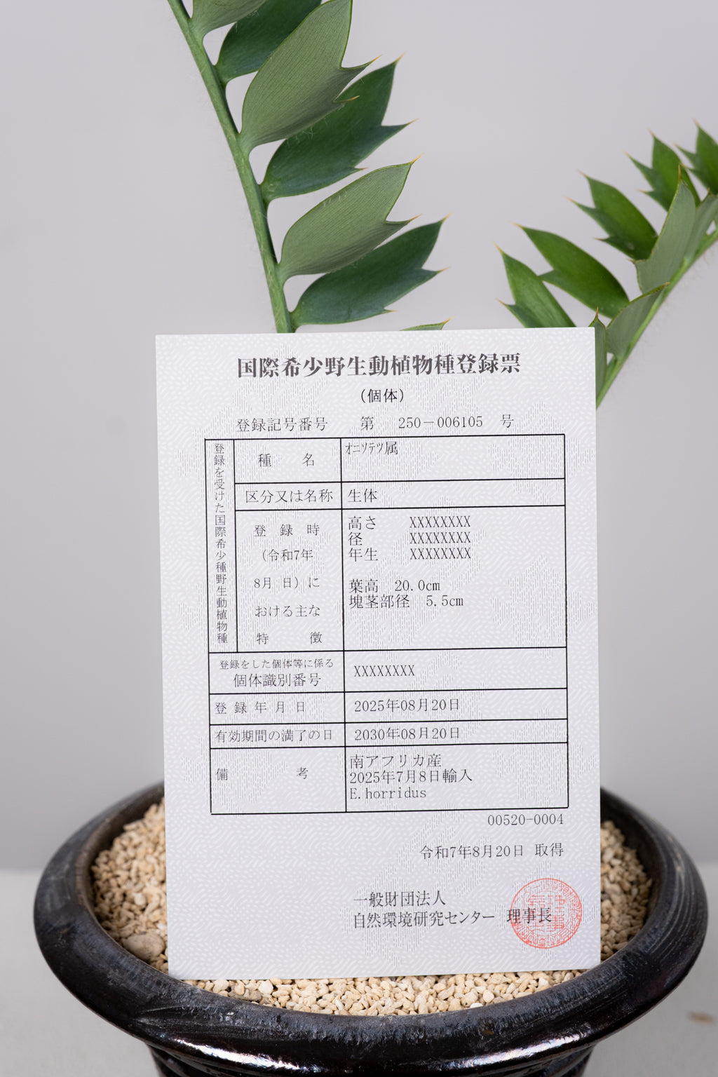 【登録番号】250-006105【登録年月日 】2025/08/20【有効期間満了日】2030/08/20【商品番号】No.9【タイプ】ザミア科オニソテツ属【入荷日 】2025/07/08【塊根部】5.5cm【高さ】20.0cm【耐寒性】大株になると-5℃以上 【発送予定】お支払い確認次第発送させて頂きます。